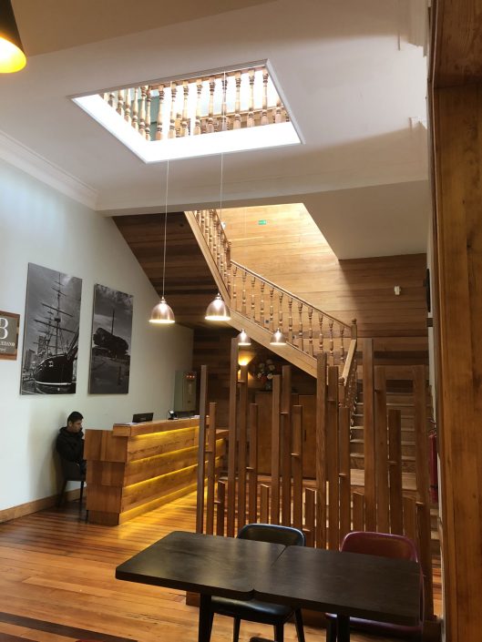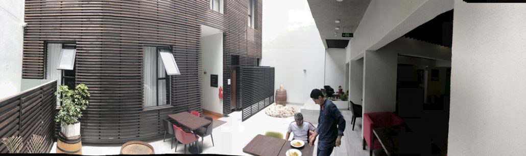 Hotel Baquedano, incorpora dentro de su programática, dos tipos de arquitectura integradas por un vacío común (patio); La casa monumento histórico Baquedano 1470, originalmente de la familia Dubost, fecha aproximada de construcción 1910, fue intervenida en su proceso histórico, primero por una universidad y luego por un hotel, intervenciones que no hicieron más que restarle protagonismo y dignidad a su especialidad y estilo original. El proyecto, básicamente, fue recuperar esos dos elementos perdidos en ese proceso, reivindicando sus especialidad original e incorporando las necesidades programáticas y de inclusión necesarias de la hostelería actual; por otra parte el edificio de patricio Lynch 1461 genera una volumetría resultante de las condiciones preestablecidas por la normativa vigente en el centro de la ciudad de Iquique. Este volumen resultante, es perforado, rescatando la modulación tipo, de las ventanas de la calle Baquedano, a las cuales se incorporan modelos de la arquitectura contemporánea, como la ventana de esquina. Como se señaló anteriormente el tránsito entre estos dos modelos arquitectónicos es a través de un vacío o patio que funciona como nexo contemplativo de ambas arquitecturas.